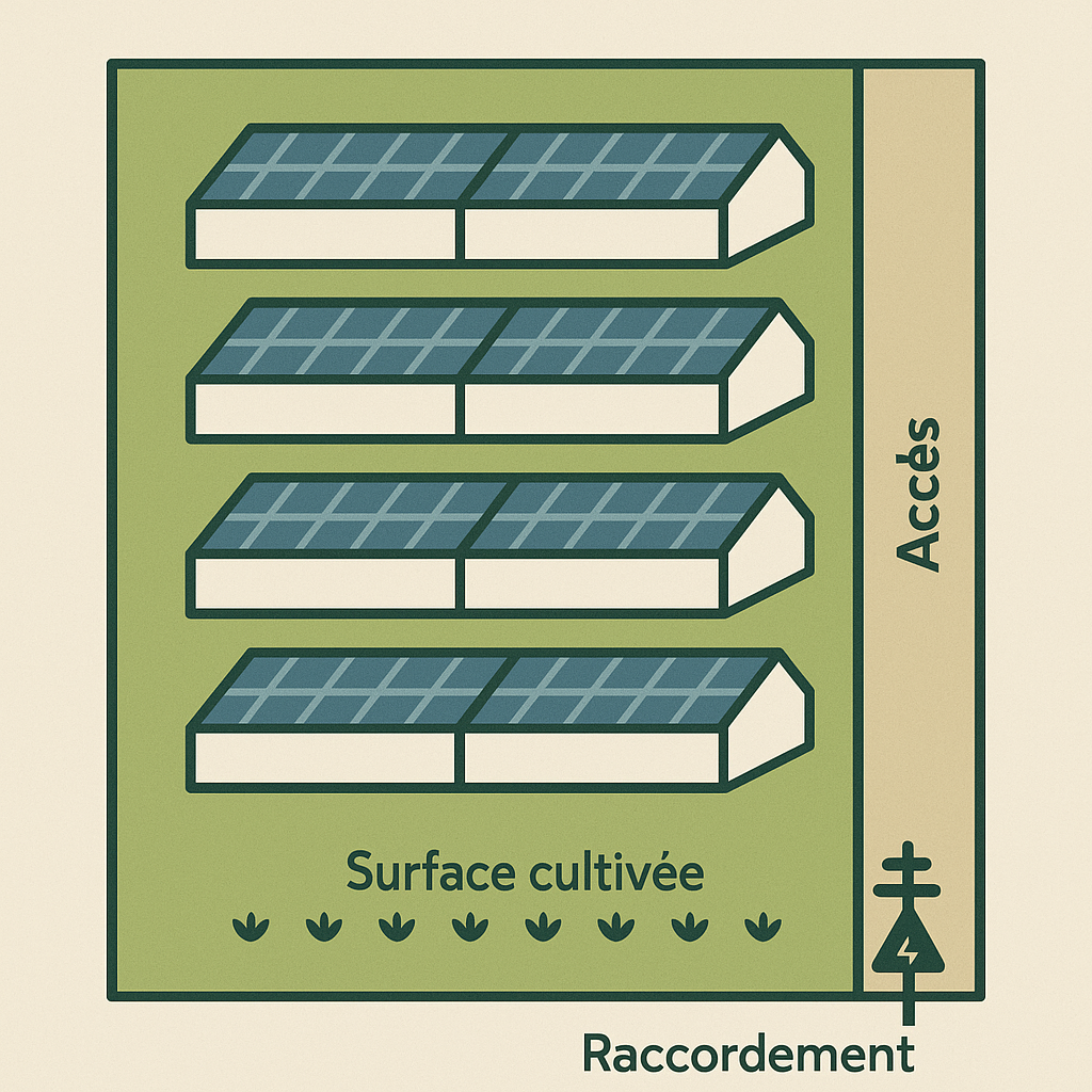 Notre projet consiste à implanter une serre agricole de 10 000 m² équipée de panneaux photovoltaïques intégrés en toiture.